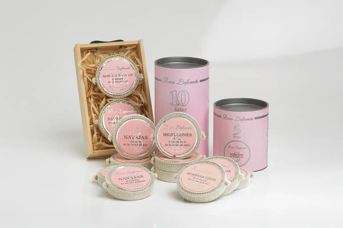 La Conservera Gallega de la familia Lafuente, Rosa Lafuente, lleva más de un siglo con un buen hacer inimitable en la fabricación de conservas selectas de pescados y mariscos 100% gallegos. Su diseño creativo y actual, junto a la calidad del producto, es un doble regalo para los amantes de las conservas Premium. Opción perfecta para sorprender a los más exigentes, lo reconocerás con sus tonos plateados que ribetean una caligrafía estilográfica sobre un fondo rosa pastel de varios matices. En su interior, almejas, berberechos y navajas al natural; mejillones en escabeche de receta propia; zamburiñas en salsa de vieira; sardinas en aceite de oliva y en escabeche; sardinillas en aceite y ventresca de atún en aceite de oliva, presentada en filetes procesados artesanalmente. Disponibles para “sonrosar” a todos estas Navidades, es un regalo que luego es fácil de compartir: las unidades que contiene cada envase están especificadas en cada lata con el número en plata.